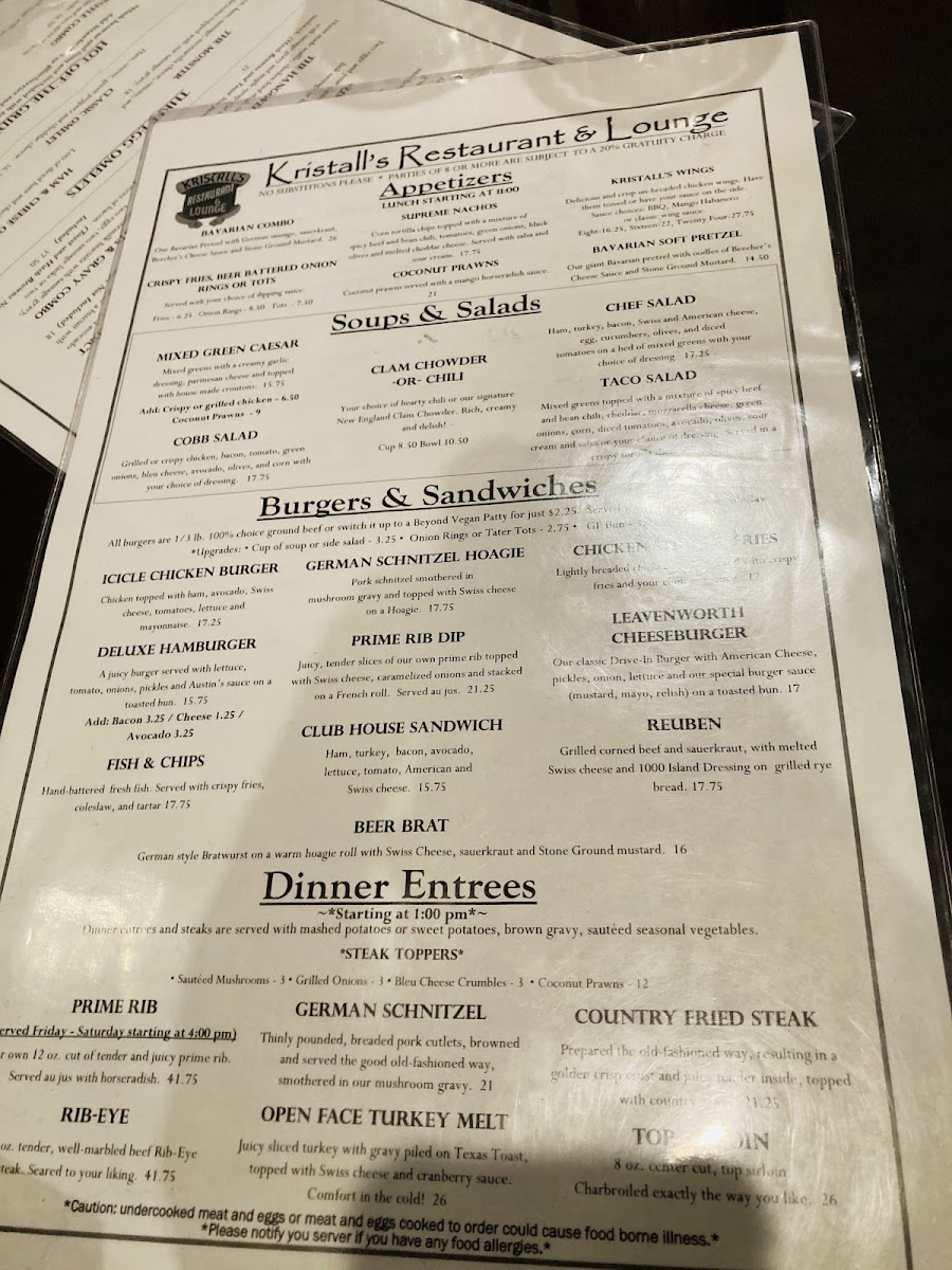 Welcome to Kristall's Restaurant & Lounge, a delightful gem located at 280 US Hwy 2, Leavenworth, WA. Here, you’ll find a menu that caters to your cravings with an array of delicious options for breakfast, lunch, and dinner. The atmosphere is warm and inviting, enhanced by friendly staff who genuinely care about your dining experience.